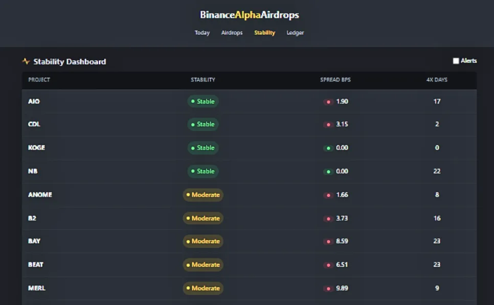 The Binance Alpha Airdrops Stability Dashboard is a powerful yet underrated feature for traders. By analyzing token stability and spread, you can plan your entries and exits more strategically.